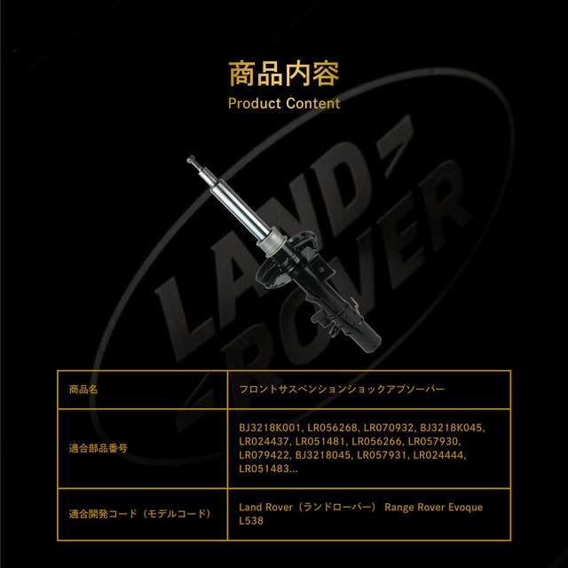 Land Rover(ランドローバー) Range Rover Evoque L538 フロントサスペンションショックアブソーバー(LR121039, LR028618, LR024444, BJ325310AD, LR092355, LR094058, BJ325349AA, LR051483, LR024490, BJ3218K001CE, GJ325310CB, BJ3218K001, LR024476, LR008026, LR056268, BJ325310BD)