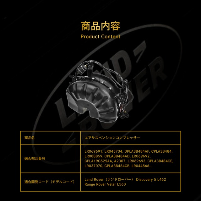 Land Rover(ランドローバー) Discovery 5 L462 Range Rover Velar L560 エアサスペンションコンプレッサー(LR069691, LR045734, LR088859, LR069692, LR069693, LR037070, LR044566, LR047172, LR056304, LR108984, LR108985, LR052301)