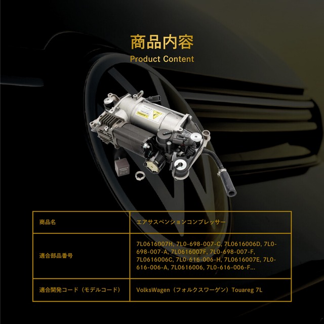 VolksWagen(フォルクスワーゲン)Touareg 7L エアサスペンションコンプレッサー(7L0616006C, 7L0616007B, 7L0616006B, 7L0616006, 7L0616007A, 7L0616006G, 7L0698007D, 7L0616007, 7L0698007, 7L0616006H, 7L0698007B, 7L0698007E, 7L0616006F, 7L0698007A, 7L0616006E, 7L0616007H, 7L0616006D)
